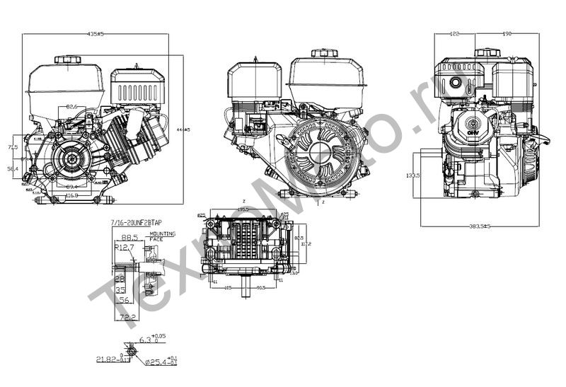 Бензиновый двигатель RATO R270 Мощность, л.с.: 9,0 Объем двигателя,см3: 270 Диаметр вала, мм: 25,0 Диаметр цилиндра, мм: 77 Ход поршня, мм: 58 Максимальная мощность,кВт: 6.6 при 3600 об. в мин. Материал цилиндра: чугунная гильза Запуск: ручной Вес, кг: 26 Емкость топливного бака, л: 6.7 Объем масла в картере, л 1.1 Габариты, мм: 420 x 395 x 430 Гарантия: 1 год